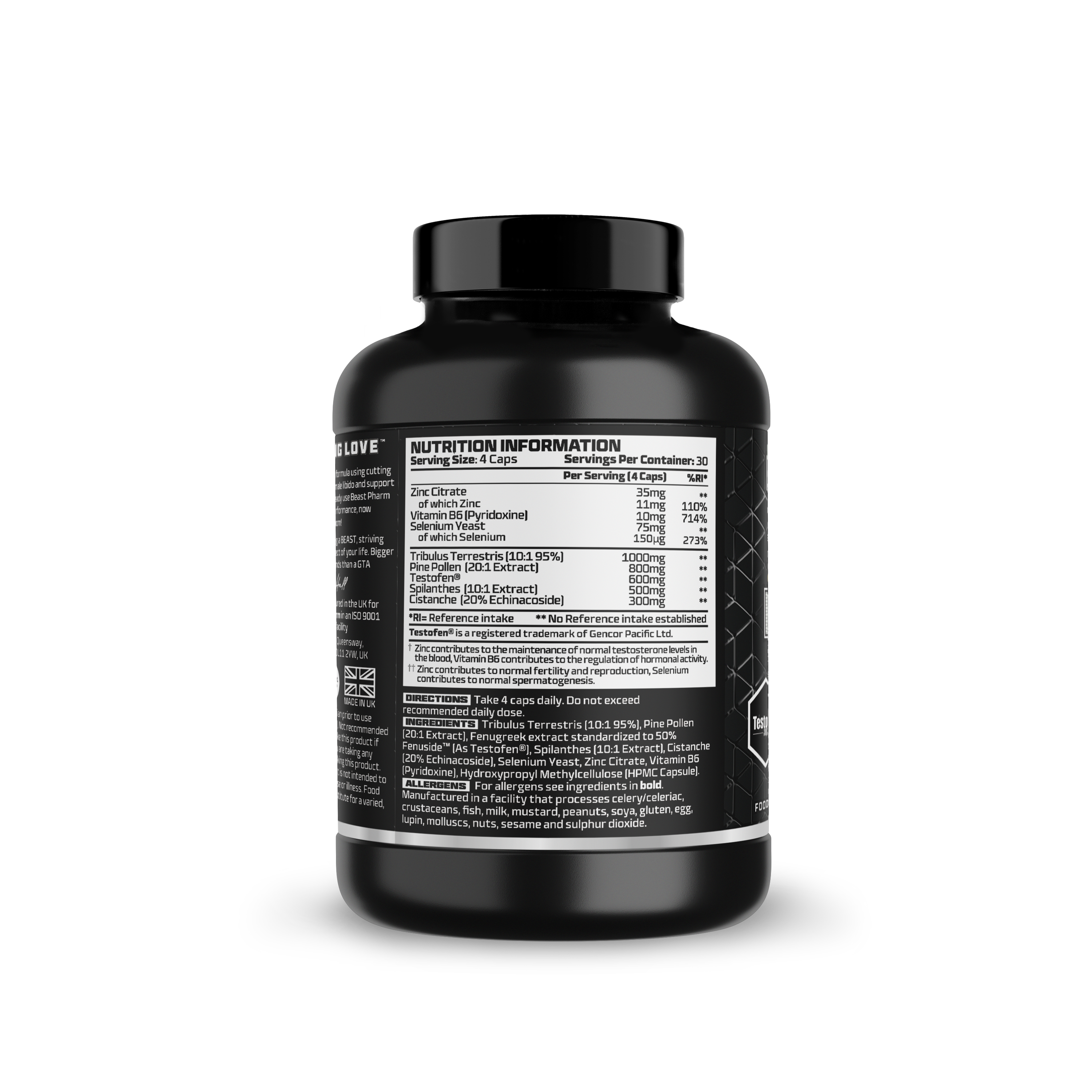 Tribulus Terrestris (10:1 95%), Pine Pollen (20:1 Extract), Fenugreek extract standardized to 50% Fenuside™ (As Testofen™), Spilanthes (10:1 Extract), Cistanche (20% Echinacoside), Selenium Yeast, Zinc Citrate, Vitamin B6 (Pyridoxine), Hydroxypropyl Methylcellulose (HPMC Capsule).