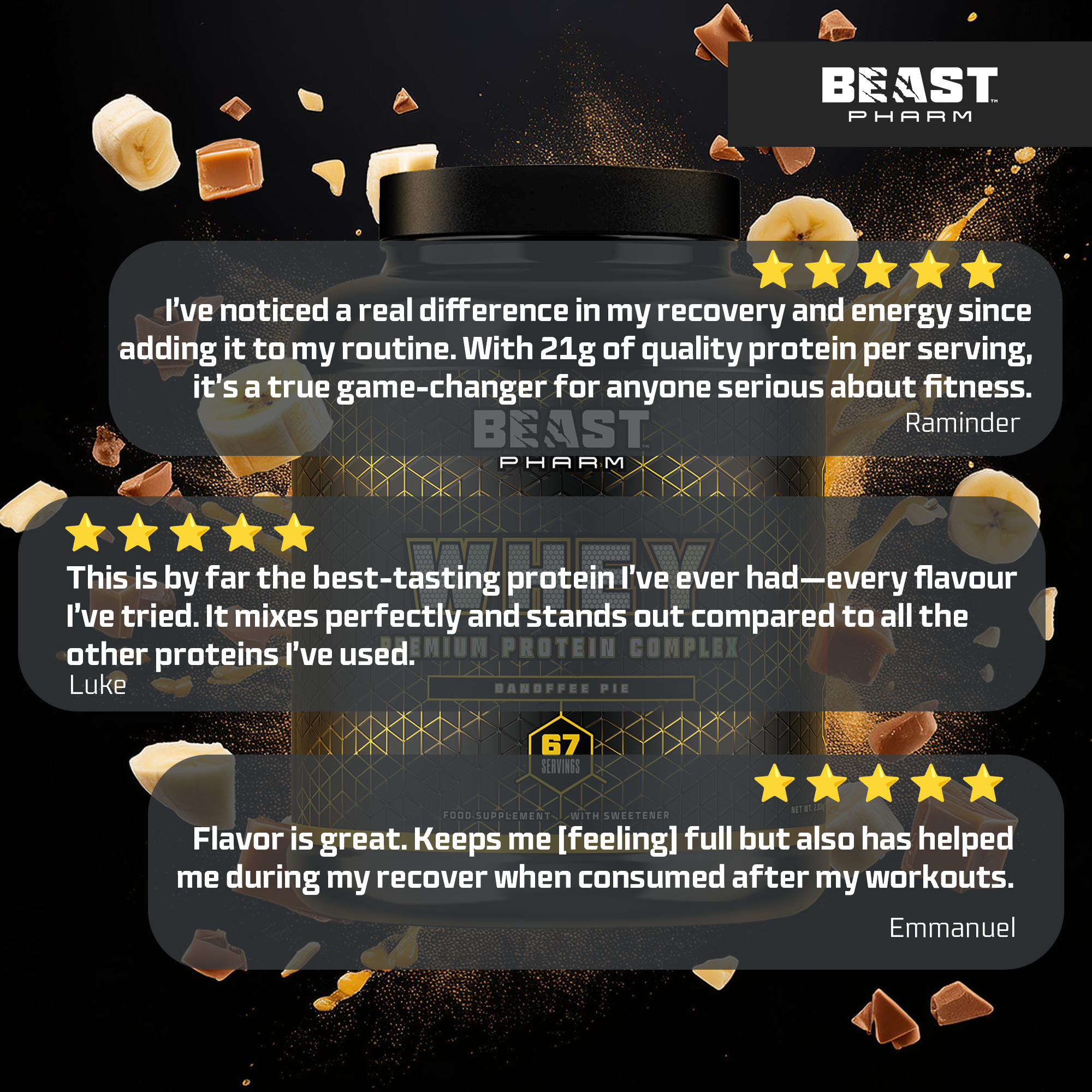 Whey Protein Concentrate (Lactomin) (Milk), Whey Protein Isolate (Milk, Soy), Banoffee Pie Flavouring, Sweetener (Sucralose), Xanthan Gum.